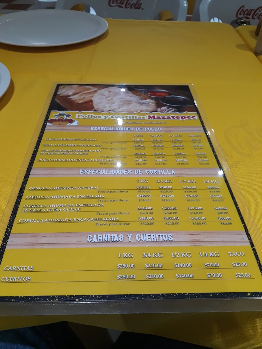 The menu at Pollos Y Costillas Mazatepec offers a delightful array of traditional Mexican dishes with bold, authentic flavors. One of the standout options is the Taco Carnitas, a perfect balance of tender, savory pork seasoned just right, served in a warm tortilla. This dish captures the essence of Mexican street food, offering comfort in every bite. Another highlight is the Catalogo de Salsas Muy Ricas, a variety of rich and flavorful salsas that pair wonderfully with nearly every dish on the menu, allowing guests to customize their meal to their preferred spice level. With a focus on fresh ingredients and classic preparations, the restaurant ensures each plate is a celebration of Puebla’s culinary traditions. Whether you're craving tacos, grilled meats, or something lighter, the menu at Pollos Y Costillas Mazatepec promises to satisfy all palates.